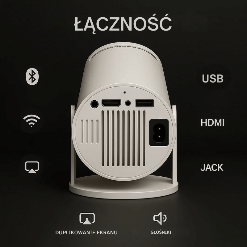Obracana konstrukcja 180° pozwala na projekcję na ścianach, sufitach i w trudno dostępnych miejscach.